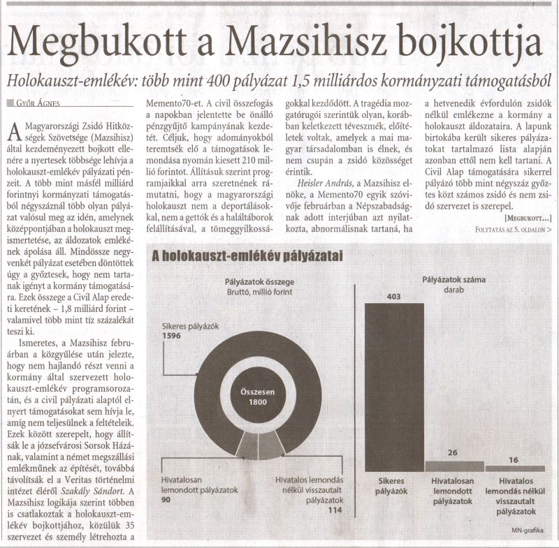 A hír: Megbukott a Mazsihisz bojkottja. (Mindössze negyvenkét pályázat esetében döntöttek úgy a győztesek, hogy nem tartanak igényt a kormány támogatására.)